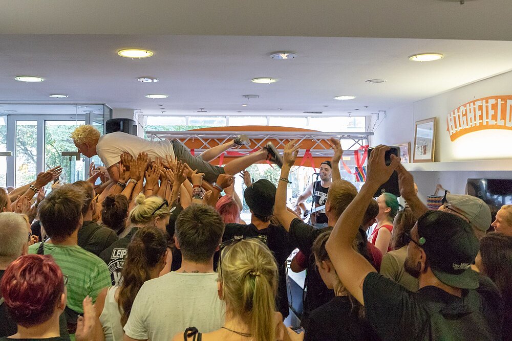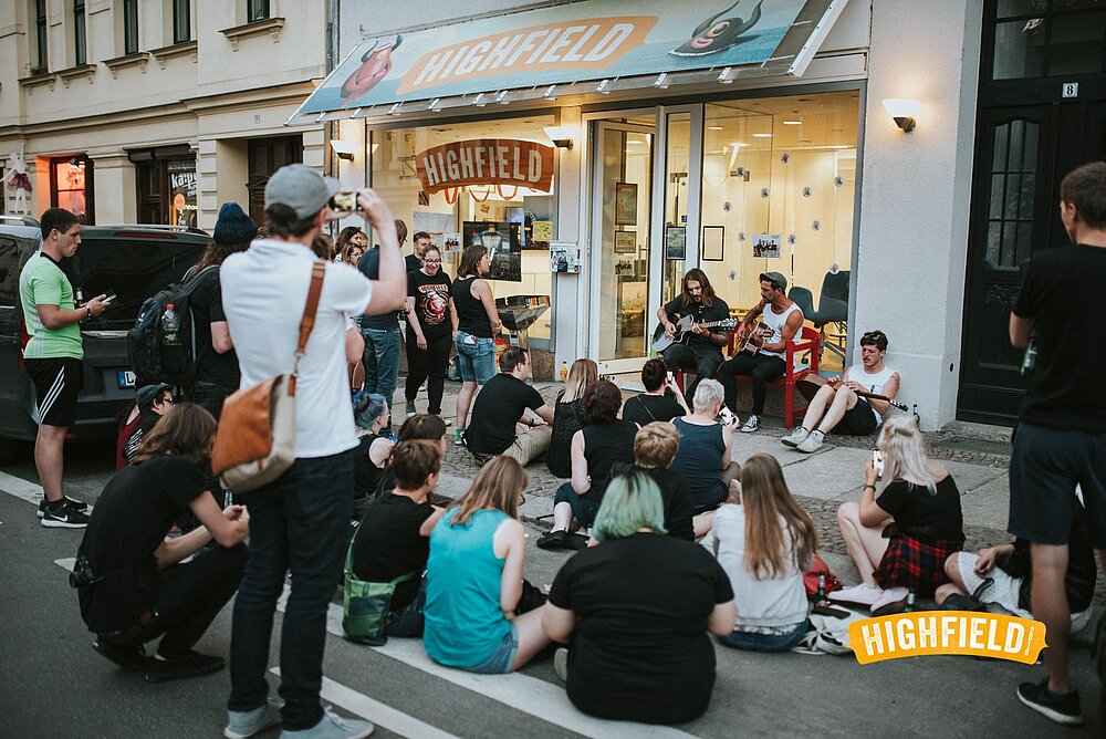 Wer also eine Vorliebe für Bollerwagen, Seifenkisten und das Highfield Festival hat, kann sich dem Streetteam gerne anschließen. Alle Infos dazu gibt es über die Festival-Facebook-Gruppe, oder - genau - im Highfield Laden. Womit wir wieder beim Thema wären: Denn ein Besuch lohnt sich nicht zuletzt auch für die besonderen Events und Konzerte, die dort immer wieder stattfinden: Egal ob Donots, Alex Mofa Gang, ZSK, Neonschwarz, Radio Havanna, Fjørt, Matze Rossi oder Massendefekt - viele Künstler nutzen den Laden auf ihren Tourneen als Zwischenstop, um mit ihren Fans ein Bier zu trinken und natürlich ein paar Lieder zu spielen. "Die Künstler haben bislang jedes Mal gelobt, wie besonders und familiär die Stimmung bei uns ist", erzählt Johanna Schmerbauch von der HKES Eventlogistik GmbH, die den (Highfield-)Laden schmeißt. "Die Alex Mofa Gang blieb nach ihrem Akustik-Set noch bis in die Nacht, um mit den Besuchern zu quatschen. Und auch bei den Donots war der Laden so voll, dass sie sich kurzfristig entschlossen haben, neben ihrem Konzert im Laden auch noch eins auf der Straße zu geben." Das sah übrigens so aus: