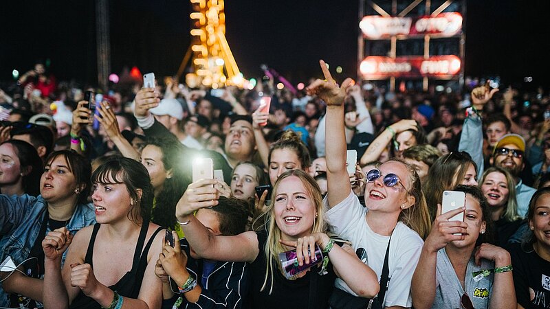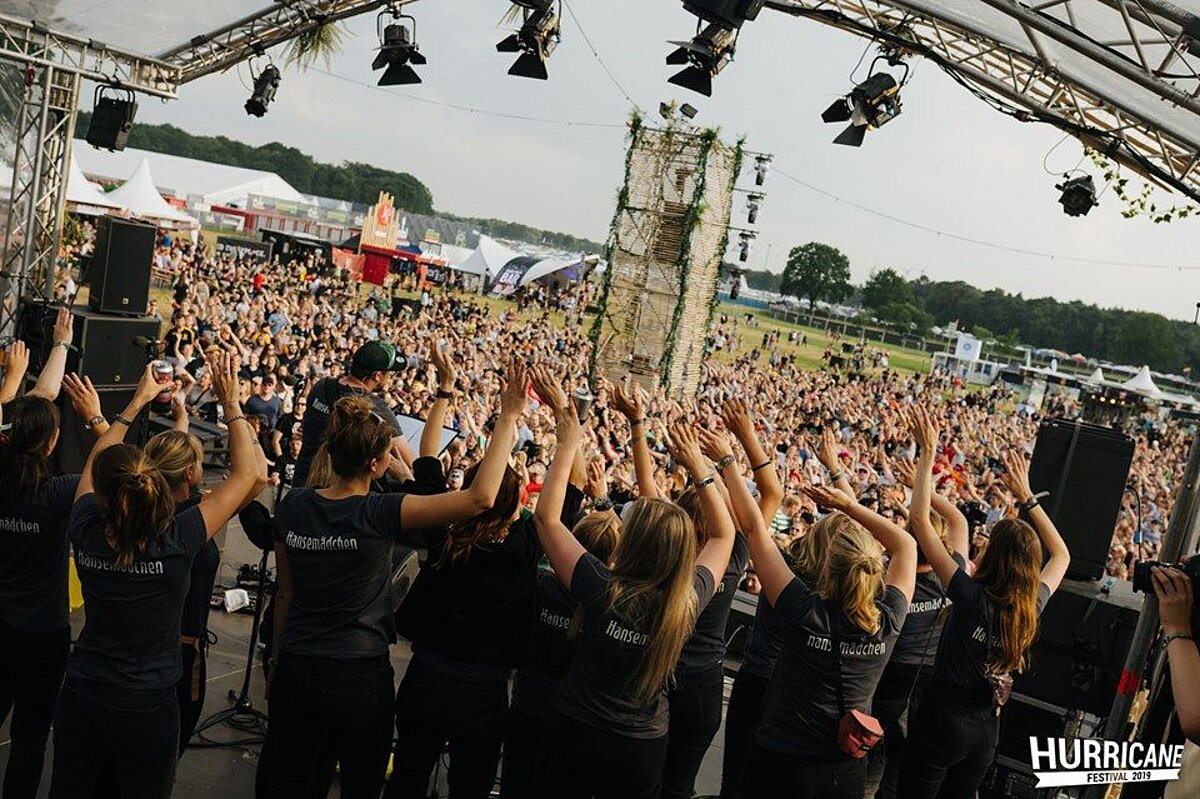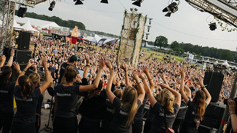 Auch im Norden war die Stimmung bei bestem Wetter schon beim Warm-up auf dem Siedepunkt: Bei der Massenkaraoke mit den Hansemädchen (rechts) haben die Festivalbesucherinnen und -besucher selbst gesungen - und zwar Headliner-verdächtig!
