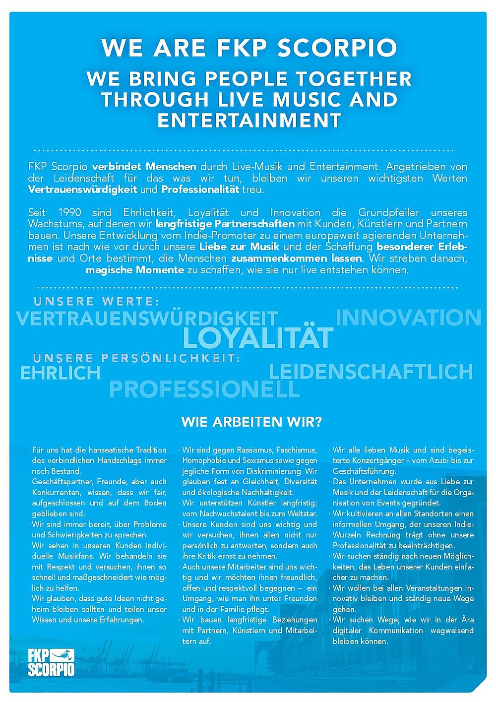 Etliche Jahre mit beträchtlichem und rapidem Wachstum haben für das Unternehmen eine Menge von neuen Mitarbeiterinnen und Mitarbeitern bedeutet, aber auch neue Geschäftsfelder und Strukturen. Was als kleiner Indie-Promoter mit großen Ambitionen begann, ist heute ein europaweites Unternehmen, das Menschen und Musik zusammenbringt. Dieses Wachstum bedeutet aber auch eine Belastung für alle Teile der Firma – von den Führungskräften über langjährige Mitarbeiter, die sich an neue Strukturen gewöhnen müssen, bis hin zu den neuen Teammitgliedern, die gerne wissen wollen, in welche Richtung das Unternehmen strebt. FKP Scorpio war in dieser Hinsicht keine Ausnahme, und die Festschreibung einer Identität nach innen und nach außen hat einige Anstrengungen gekostet.